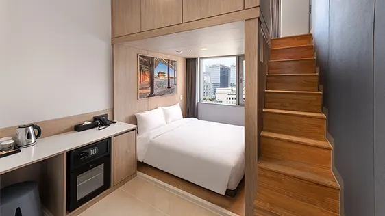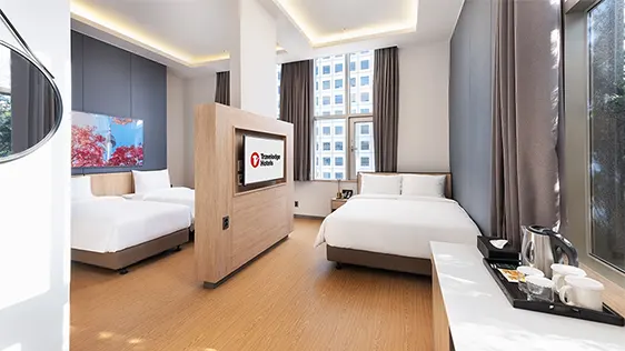 全173室の客室はモダンで機能的な造り。全室にエアコン、アメニティ付き専用バスルーム、無料Wi-Fi、テレビ、ミニ冷蔵庫、ワークデスク、スリッパ、セーフティボックスを備え、一人旅からカップル、ご家族まで快適に過ごせます。